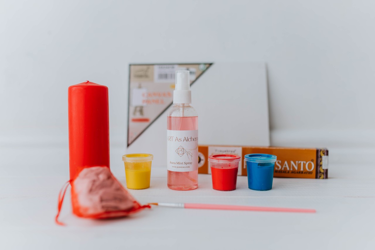 Includes a candle, ceremonial tea bags, reiki’d aura spray, matching incense, a blank canvas, primary colour paint pots, a paintbrush, and a guided meditation.