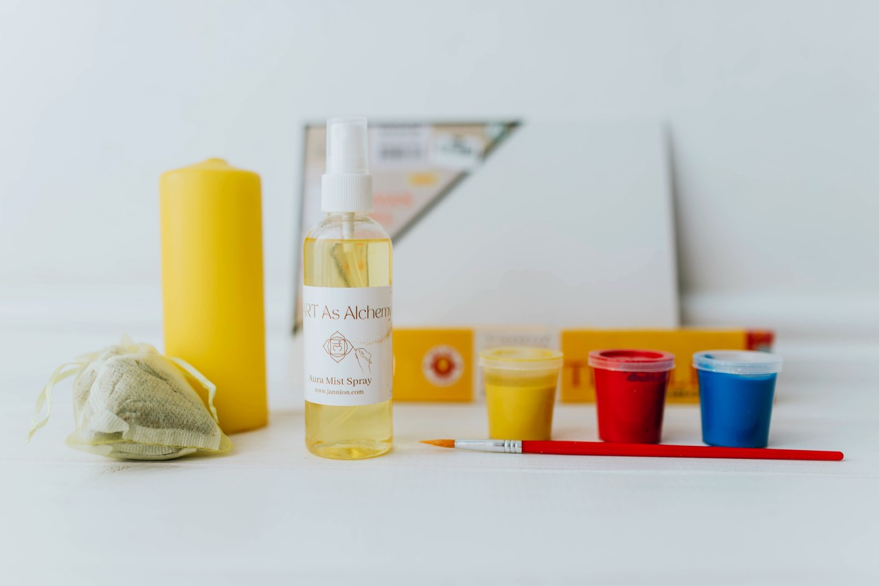 Includes an candle, ceremonial tea bags, reiki’d aura spray, matching incense, a blank canvas, primary colour paint pots, a paintbrush, and a guided meditation.